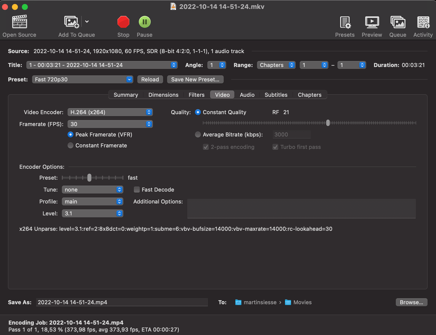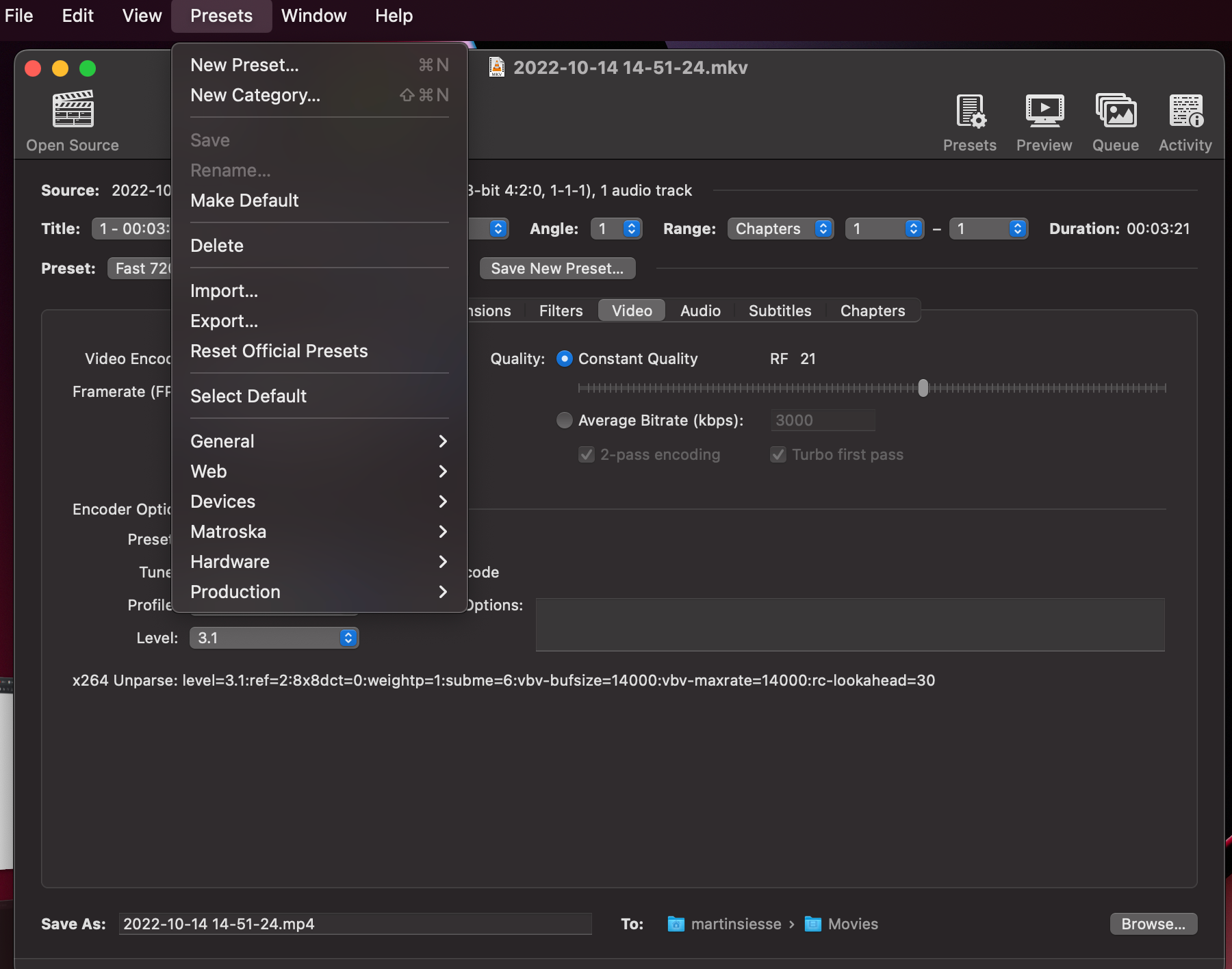 - Une fois la vidéo importée, dans la barre d'outils, cliquez sur "Presets". Tout en bas, vous devriez voir les catégories de presets ; vous pouvez les parcourir et choisir celle que vous préférez. Je vous conseille Fast1080p30 ou Fast720p30 pour une qualité HD avec un framerate réduit mais pas inregardable.